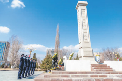 新疆博尔塔拉蒙古自治州博乐市乌图布拉格边境派出所警察向英雄模范纪念碑敬礼致敬。 冶金虎摄(人民视觉)
