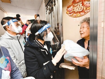 3月29日,招商局集团组织“招商暖邨”关爱行动走进香港上环信德中心,向中心物业后勤人员、商户店员及街坊市民派送快速检测包及“疏风解毒胶囊”各2000份。