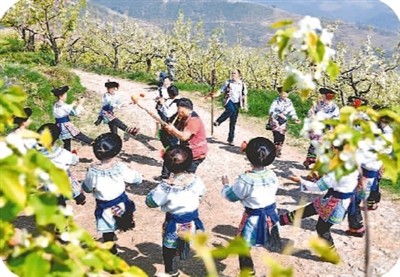 在云南省巍山彝族回族自治县西部的马鞍山乡三胜村,3.9万亩红雪梨让当地村民的生活发生了巨大变化。村民依靠种植红雪梨,办民宿和农家乐等,每年增收近10万元。图为梨花盛开的季节,身着盛装的彝家人正在表演欢快的歌舞。 陆向荣文/图