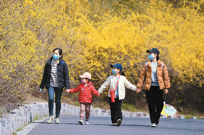 日前,山东青岛森林野生动物世界内的连翘、杏花、樱桃花、二月兰等竞相盛开,人们在园内畅游,享受美好春光。