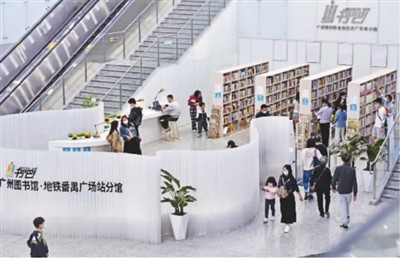 近日,在广东省广州市地铁番禺广场站站厅内,市民在书吧里休闲看书。该书吧由广州图书馆、广州城际铁路运营有限公司合作共建,藏书5000余册,是附近市民休闲阅读的好去处。