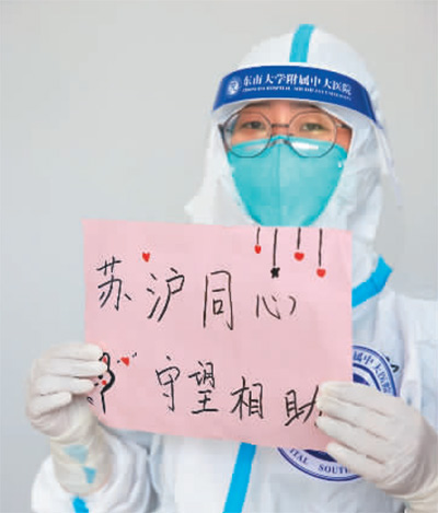 4月6日,在上海临港方舱医院,一名来自江苏的医生展示“苏沪同心 守望相助”的口号。 新华社记者 金立旺摄