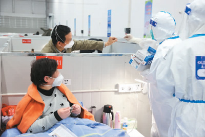 4月6日,在上海临港方舱医院,来自江苏的医护人员在帮感染者查看体温。 华山医院供图(新华社发)