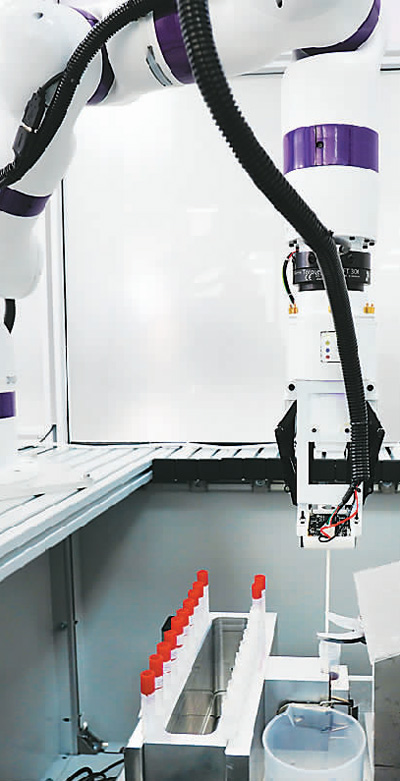 图为4月1日,咽拭子核酸检测采样机器人(功能展示机)对采样棉签进行处理。