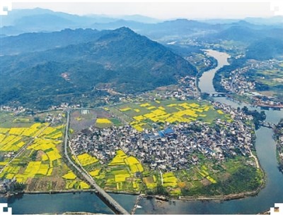 安徽省休宁县双龙村春意盎然,徽派民居村落与油菜花田、青山碧水相映衬,秀美如画。 |