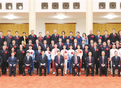 在欢快的乐曲声中,习近平等为受表彰的个人和集体代表颁奖。