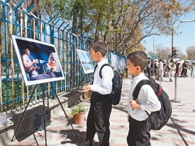 图为阿富汗民众在喀布尔街头观看“贫困与希望”摄影展。