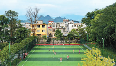近日,在广西壮族自治区恭城瑶族自治县西岭镇西岭村内,孩子们在智慧体育公园中踢足球。 |