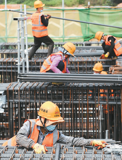 4月12日,贵南高铁南宁北站站房框架柱开始进行混凝土浇筑作业,车站主体工程建设正式启动。贵南高铁站房工程建设全面拉开。贵南高铁(贵州贵阳至广西南宁)是我国“八纵八横”高速铁路主通道包头至海口通道的重要组成部分。图为中铁建设集团工人在施工。