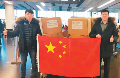 图为2020年2月,周彦君(左)与商会骨干成员一起为中国同胞筹集运送防疫物资。 |