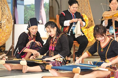2021年黎锦技艺研修班开班,受到海南省黎族传统纺染织绣从业者欢迎。研修班培训内容包括传统黎锦技艺学习和电子商务、短视频等。图为学员符慧莉(左二)在老师指导下学习织黎锦。 |