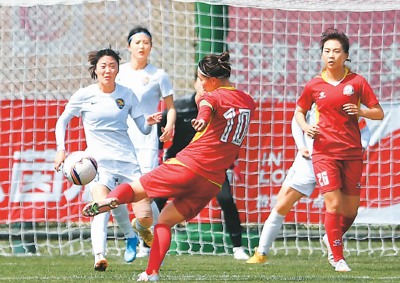 图为河南建业女足队球员雷佳慧(中)在同上海农商银行队的比赛中射门。