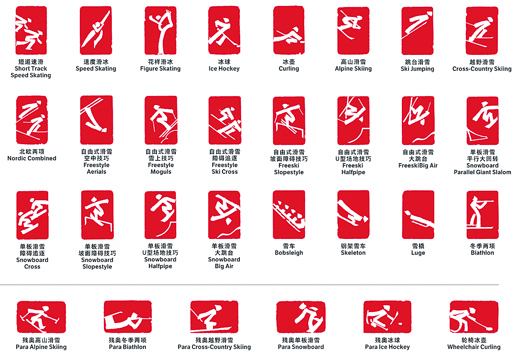 二〇二〇年十二月三十一日,北京二〇二二年冬奥会和冬残奥会体育图标正式发布。图为北京二〇二二年冬奥会和冬残奥会体育图标。 |