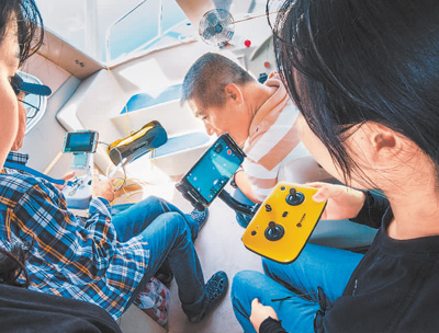 在浙江淳安千岛湖,旅行纪录片导演阿伦团队成员在手机上查看国产品牌水下无人机传回的画面。 |