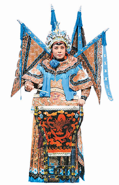 传统老旦戏限于老年人的年龄特征,往往以唱为主,动作很少,表演空间非常有限,表演手段也不多,翟墨开创性地设计了老旦“起霸”“擂鼓”这两个颇具看点的艺术手段。