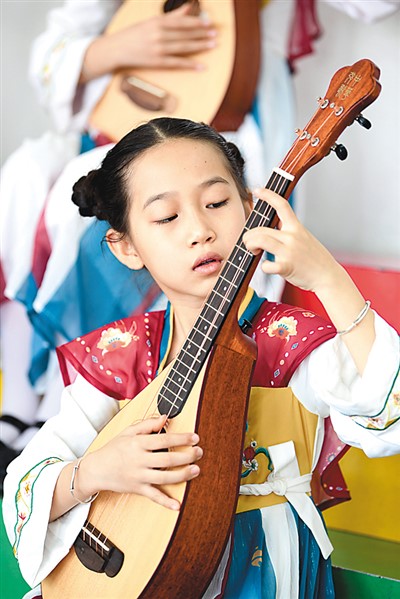图为学生正在音乐教师的指导下练习鸣鸠琴。