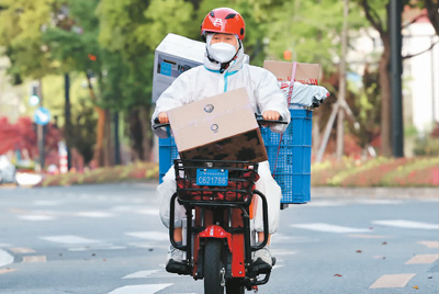4月17日,京东物流的快递员罗明在上海市虹口区送货。 |
