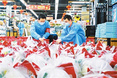 4月17日,上海市奉贤区西渡街道社区发展综合服务中心工作人员入驻超市,承担分拣配货等工作。 |