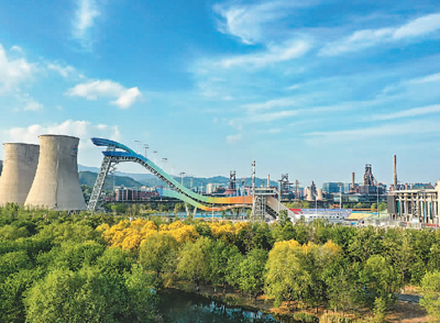近日,北京冬奥公园与首钢园已在高线公园、冰雪森林和首钢大桥下三处节点实现互联互通,冬奥场馆、工业遗存、自然山水在这里实现融合。图为冬奥公园湿地景观与首钢滑雪大跳台交相辉映。