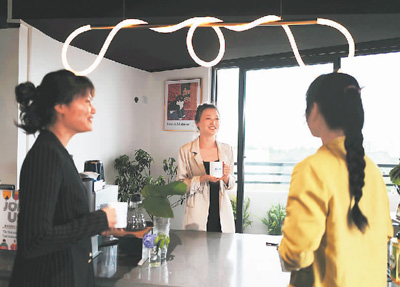 三名创业者在海南华二代孵化器的公共咖啡区交谈。 |