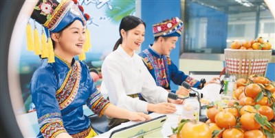 今年以来,广西壮族自治区崇左市扶绥县融媒体中心联合多所高校团委开展农产品直播带货活动,邀请网络主播志愿者走进直播间,帮助售卖当地农产品,拓宽销售渠道,助农增收,助力乡村振兴。图为扶绥县融媒体中心直播室内,网络主播志愿者在售卖当地沃柑。