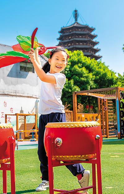 近年来,河北省石家庄市正定县积极推动非遗进校园。常山战鼓是河北省的国家级非物质文化遗产。正定县幼儿园成立幼儿战鼓队,让非遗传承后继有人。图为正定县幼儿园小朋友在练习常山战鼓。