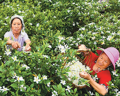 湖南省郴州市嘉禾县村民在采摘栀子花上市。 |