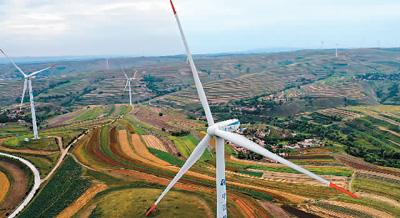 位于甘肃省定西市通渭县华家岭的梯田与风电机组。 |