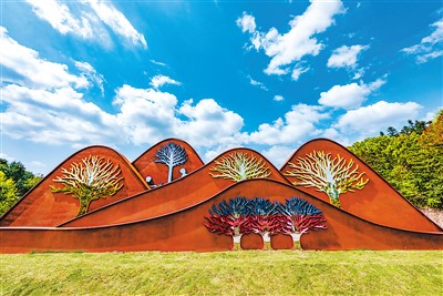 传统美学的当代呈现。作者注重从中华优秀传统文化中汲取创作的丰厚滋养,把“三山五岳”“三生万物”等传统文化的概念和智慧,运用于雕塑作品创作中,丰富了作品的文化内涵和思想厚度,在激活中华优秀传统文化生命力上作了尝试。仁者乐山。在中华传统文化中,山一直是人们精神寄托的载体。雕塑主体由五座山峰形成,意指三山五岳。三山五岳是中国人意识中锦绣江山的代表,也是人文汇聚的高地。作品巧妙地将中国人对三山五岳的人文情感融入环保主题。雕塑中的树干空间可以容纳3人进入,让动态的人树形成互动景观,表达了“三生万物、三人成众、众心成城”的意蕴。同时,作品符合中国以意入境的山水画传统美学,在中华优秀传统文化的语境中探寻符合当代视角的审美意趣。