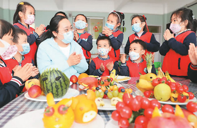 5月11日,在山东省东营市文汇街道中心幼儿园,老师在指导学生学习各种水果的营养价值,引导学生树立健康饮食新风尚。 |