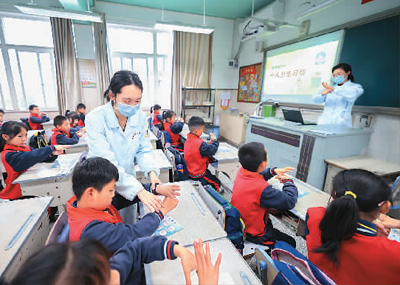 5月11日,浙江省湖州市德清县阜溪街道三桥小学邀请卫生院的医护人员来到学校,给孩子们普及科学防疫知识。 图为医护人员正在教授学生“七步洗手法”。 蔡 俊摄(人民视觉)