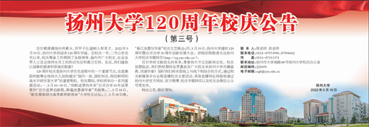 百廿载厚德抱朴传薪火,双甲子弘道树人育英才。2022年5月19日,扬州大学将迎来120周年华诞。自校庆一号、二号公告发布以来,校庆筹备工作得到了各级领导、海内外广大校友、社会各界人士及全体师生员工的热切关注和鼎力支持。在此,我们谨致以诚挚的感谢和崇高的敬意!