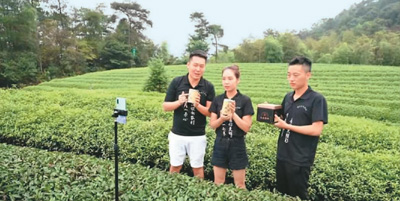 在福建武夷山市星村镇前兰村南山岗,由3位青年组成的直播团队在茶园直播推广当地茶叶。 |
