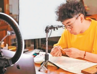 非遗传承人郎佳子彧在直播制作面人。 |