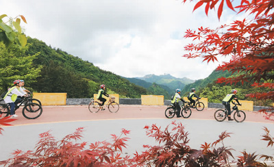 骑行爱好者在张家界市武陵源区环景区南线的公路上骑行。 |