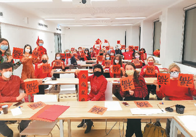 陈意雨在雅盖隆大学克拉科夫孔子学院的虎年迎新活动中,教外国学生写福字。 |