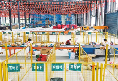 近年来,湖北省蕲春县张榜镇建成了覆盖镇、村、组三级农村快递物流体系,畅通了城乡双向流通渠道,助推乡村消费升级。图为该镇韩榜村物流园工作人员正在分拣村组物流快件。 |