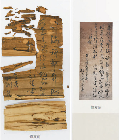 经安徽博物院文物科技保护中心修复的清代安南大司马行书条修复前后对比图。 |