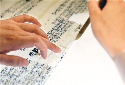 在安徽博物院文物科技保护中心纸质文物修复室,工作人员对古籍文物进行补全。 |
