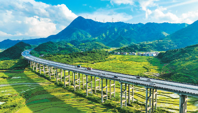 6月2日,湖南省常宁市庙前镇泉井村,许昌—广州高速公路老屋场特大桥与农房民居、绿色田园相映成趣,呈现出一幅人与自然和谐共生的生态画卷。
