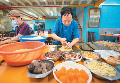 兰香阁老板陈志伟(右)在包粽子。 |