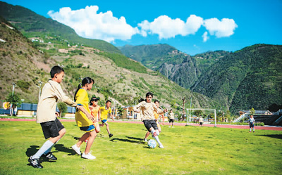 图为云南省怒江傈僳族自治州泸水市大兴地镇格力小学学生在球场上踢足球。 |