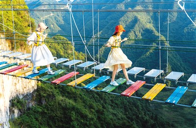 游客在贵州省铜仁市万山区朱砂古镇景区体验悬崖步道项目。 |