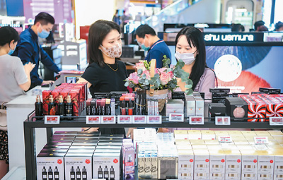 不少商家结合政府发放的消费券,推出系列促销活动。图为位于海南省海口市日月广场的海控全球精品免税城内,不少消费者前来选购化妆及洗护用品。 |