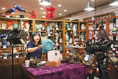 近日,北京市启动“2022北京网络直播促销月”,组织知名企业、直播平台、个人主播等广泛参与,助力复工复产、复商复市。图为6月18日,北京市珐琅厂有限责任公司工作人员在网络直播间内展示景泰蓝商品。 |