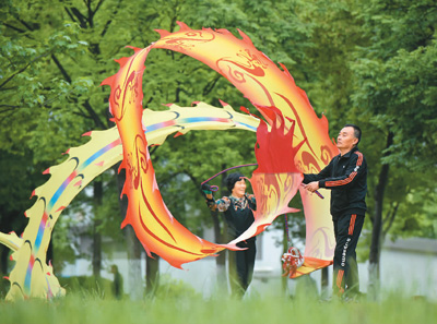 5月7日,市民在江苏省淮安市清江浦区大运河广场舞彩带龙。 |