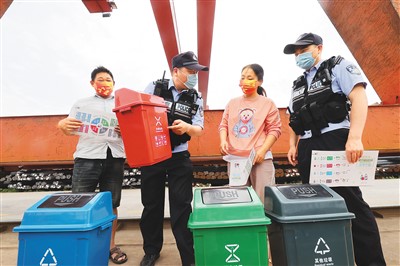 6月4日,浙江省湖州市德清县运河生态联勤警务站民警为京杭大运河新市段沿线企业员工讲解垃圾分类知识。 |