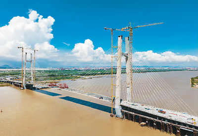 近日在广东省广州市南沙区的红莲大桥建设现场,工程建设者正在抓紧作业,推进各环节工程建设提速。作为南沙的重点交通基础设施项目,大桥建成后将主要承担广州南沙自贸区万顷沙保税港加工制造业区块与南沙港的货运交通联系。图为建设现场。
