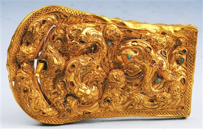 焉耆县金疙瘩遗址出土的汉代八龙纹金带扣精美绝伦,引人驻足。金带扣方尾圆首,呈马蹄形,由金质模压捶揲成型。扣面凸显1条大龙和7条小龙,作群龙戏水状,在激流漩涡间翻腾跳跃,首尾相顾,扬爪摆尾,动感十足。整件带扣工序繁复,图案设计极为精巧,是一件难得的精品。专家认为,八龙纹金带扣应是汉朝赏赐给西域城郭王公贵族的礼物,体现了汉代中央皇权对西域的统治权威。