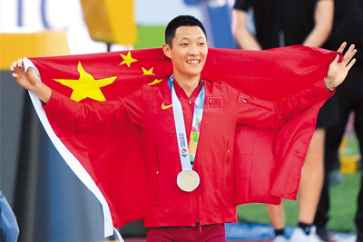 这是王嘉男在2015年北京田径世锦赛上夺得铜牌之后,收获的第二枚世锦赛奖牌。
